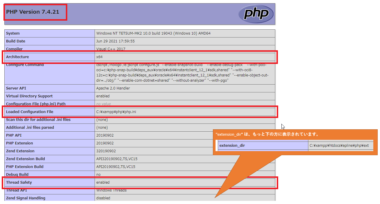 上記の該当行で「スレッドセーフですか」列の値がphpinfoの「Thread Safety」確認した値、"enable"だった場合は"はい"、"disable"だった場合は"no"となっている行を確認します。