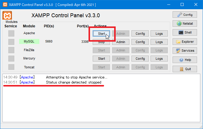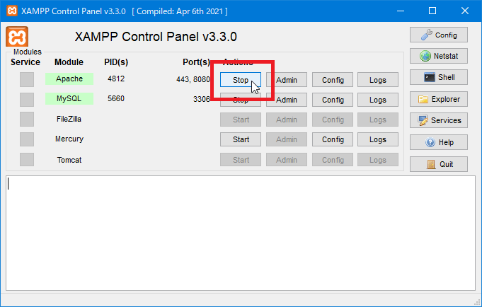XAMPPであれば、XAMPPのコントロールパネルを起動して[Stop]ボタンをクリックします。