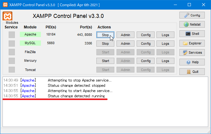 最後にWebサーバーを再起動します。