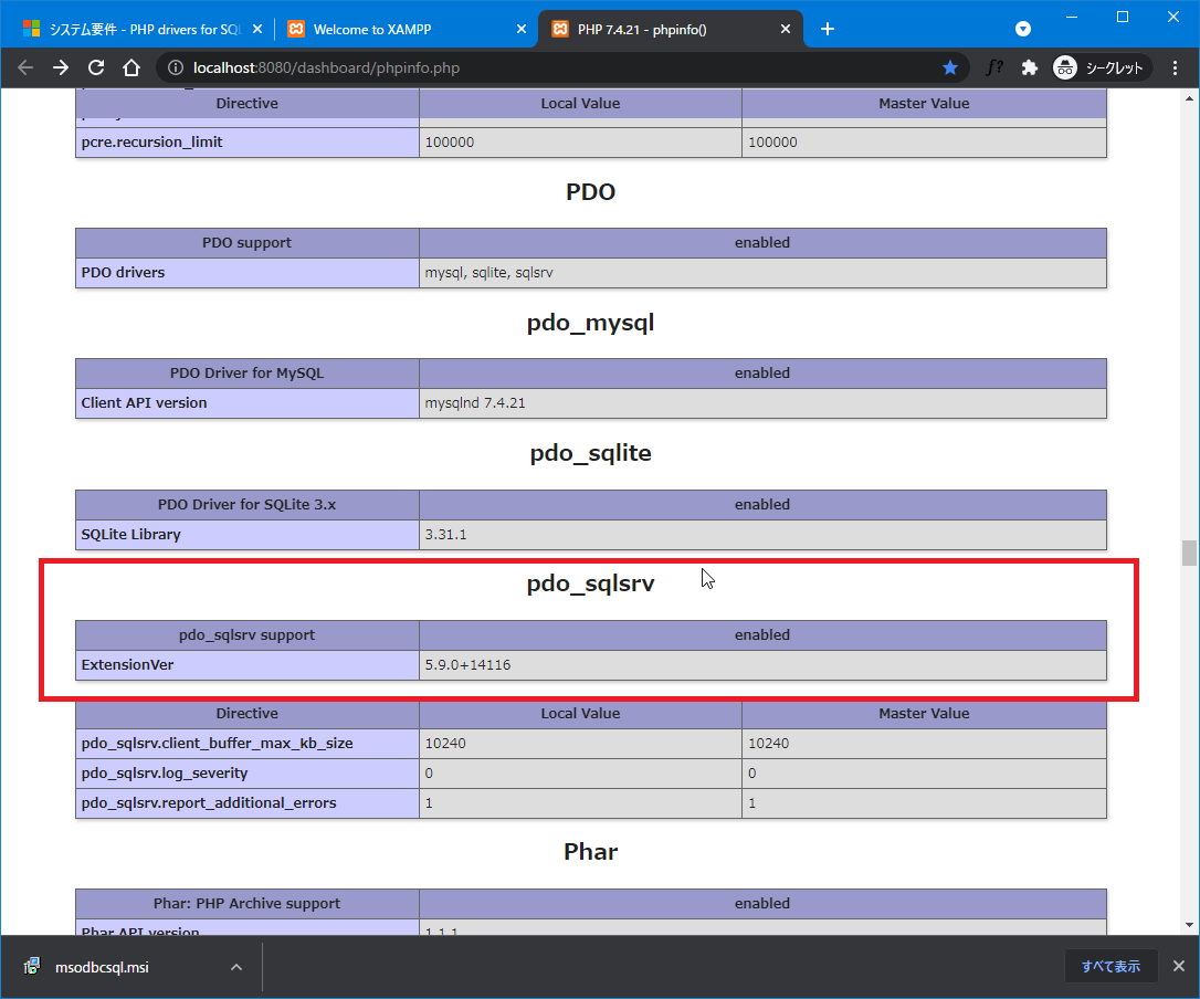 まずは、PHPがSQL Serverに接続するために必要な拡張モジュールをダウンロードします。
