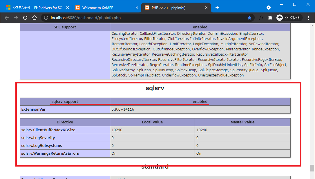 また、「sqlsrv」セクションが表示されていて「sqlsrv support」が"enabled"と表示されているはずです。