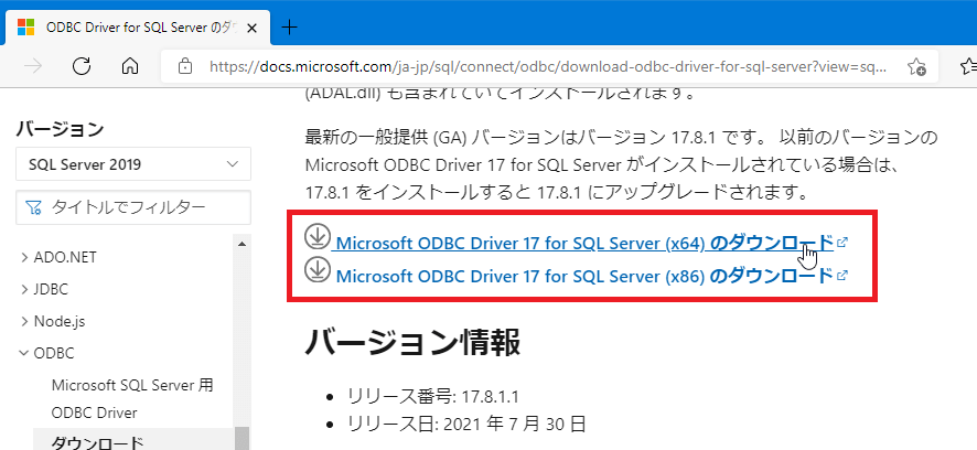 SQL Serverに接続するためには、ODBCドライバが必要となるので、ダウンロードしてインストールしましょう。
