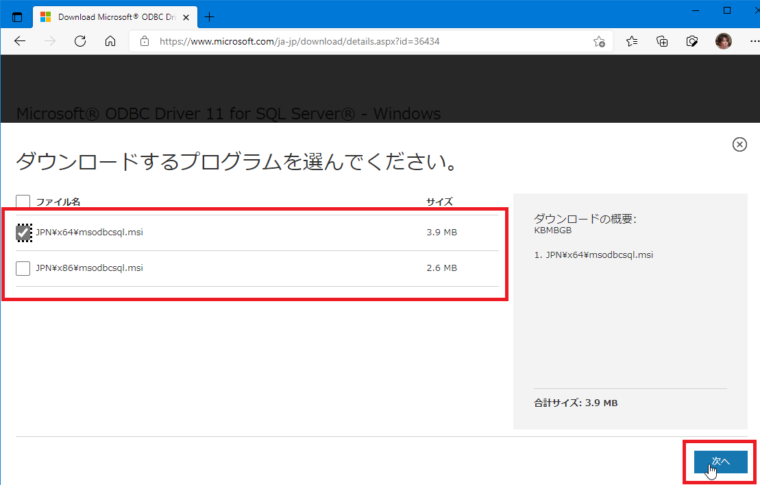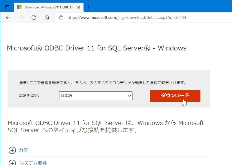 「Microsoft ODBC Driver 11 for SQL Server」は以下のページからダウンロードできます。