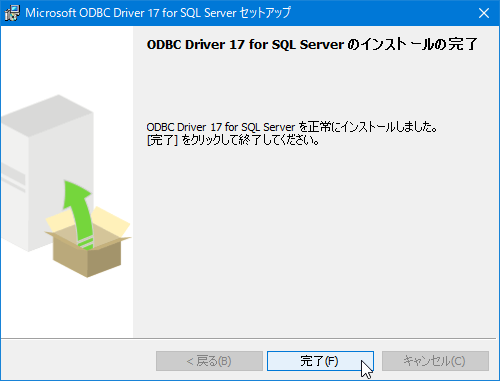 [Microsoft ODBC Driver 17 for SQL Server のインストールの完了]画面が表示されるので[完了]をクリックします。