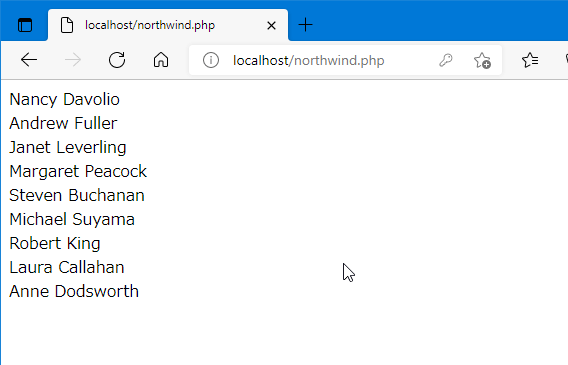 このサンプルプログラムを実行するとWebサーバー(localhost)上にインストールされたSQL Serverのデータベース「Northwind」に接続し、「Employee」テーブルの全レコードから「FirstName」と「LastName」フィールドの値を取得してブラウザに一覧表示します。