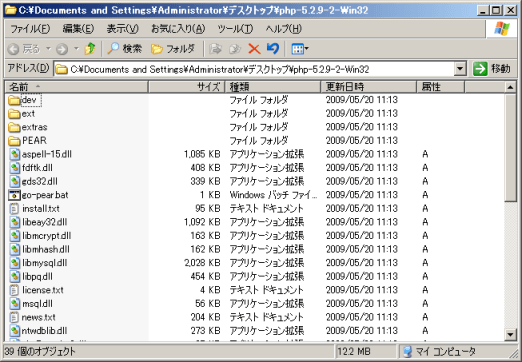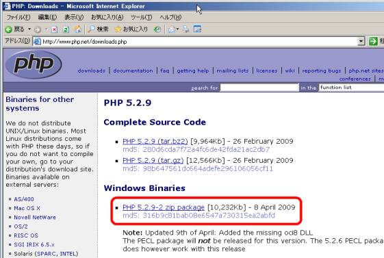 今回は、現在の最新バージョンである「PHP 5.2.9-2」をダウンロードしてファイルを配置するところまでの説明です。