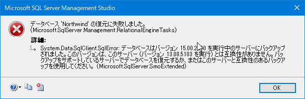 下位バージョンのSQL Serverへのデータベースの復元