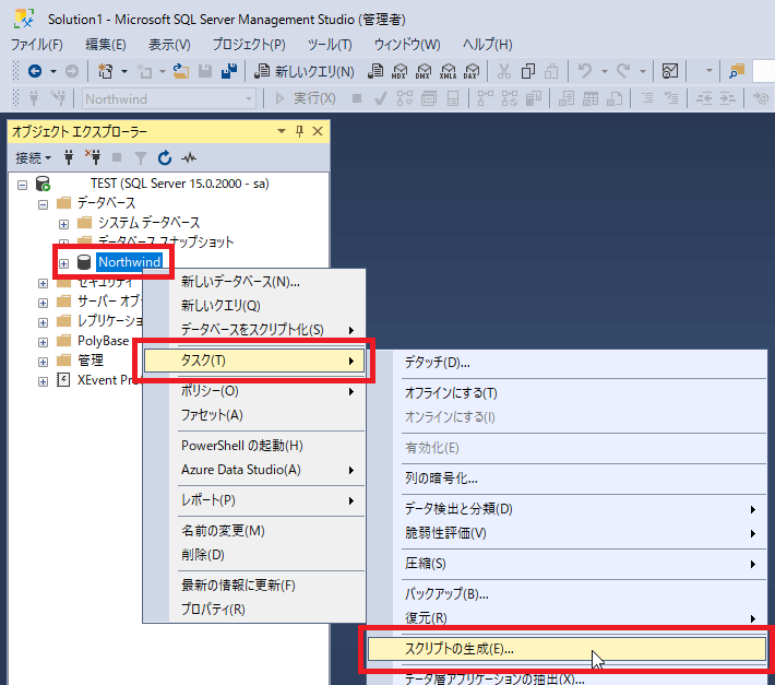 [Microsoft SQL Server Management Studio]を起動し、下位バージョンに復元したいデータベースを右クリックし、[タスク] > [スクリプトの生成]をクリックします。