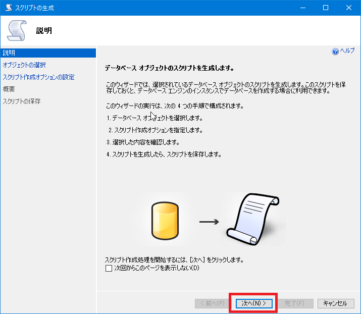 [スクリプトの生成]画面が表示されるので、[次へ]をクリックします。