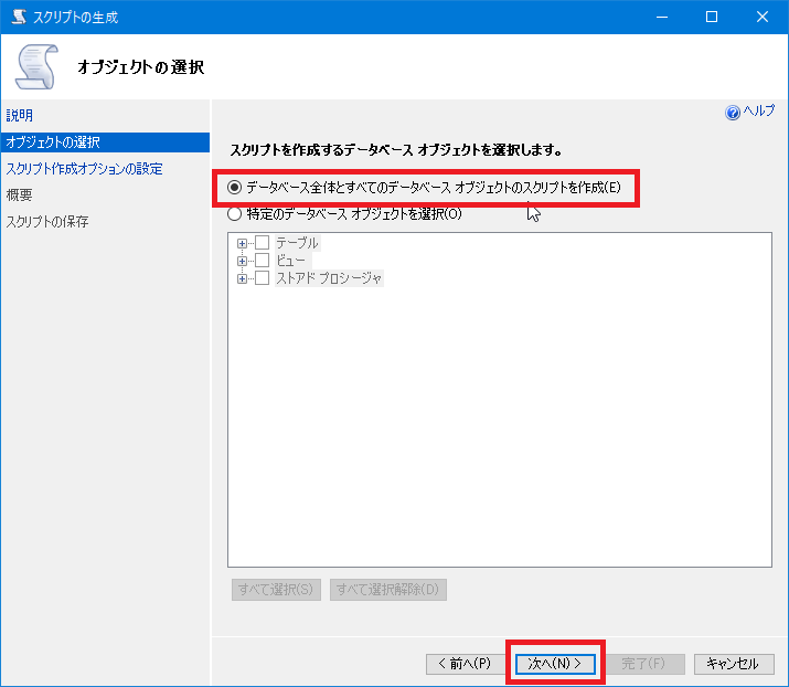 [オブジェクトの選択]画面が表示されるので、[データベース全体とすべてのデータベース オブジェクトのスクリプトを作成]をオンにして[次へ]をクリックします。