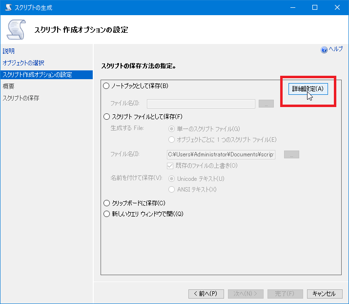 [スクリプト作成オプションの設定]画面の[スクリプトの保存方法の指定。]から[詳細設定]ボタンをクリックします。