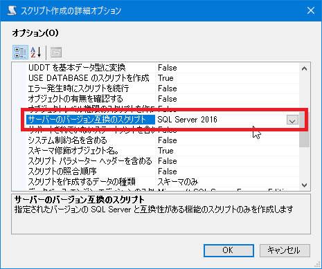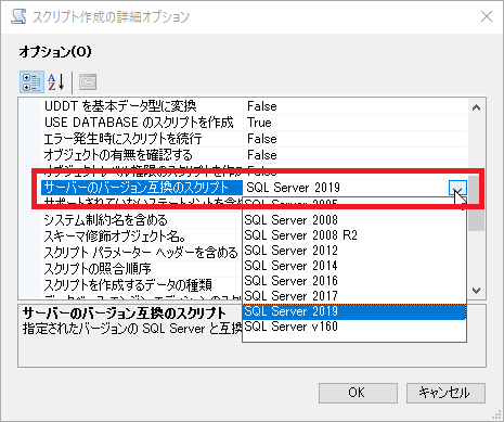 [スクリプト作成の詳細オプション]画面のオプションから[サーバーのバージョン互換のスクリプト]のドロップダウンリストを表示して、復元したい下位バージョンのSQL Serverのバージョンを選択します。