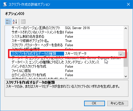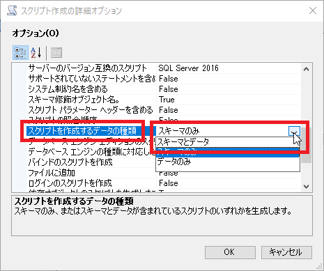 さらにオプションから[スクリプトを作成するデータの種類]のドロップダウンリストを表示して「スキーマとデータ」を選択します。