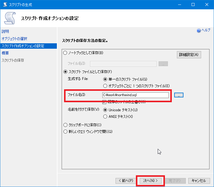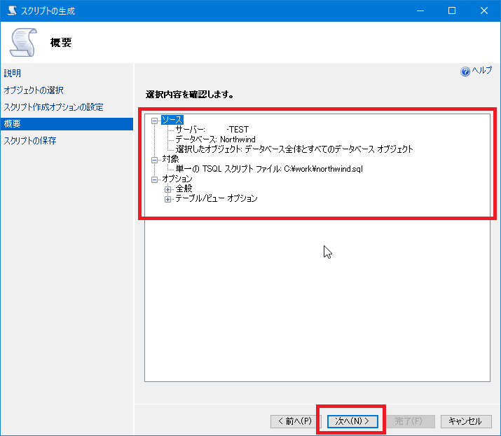 [スクリプト作成オプションの設定]画面に戻るので[次へ]をクリックします。
