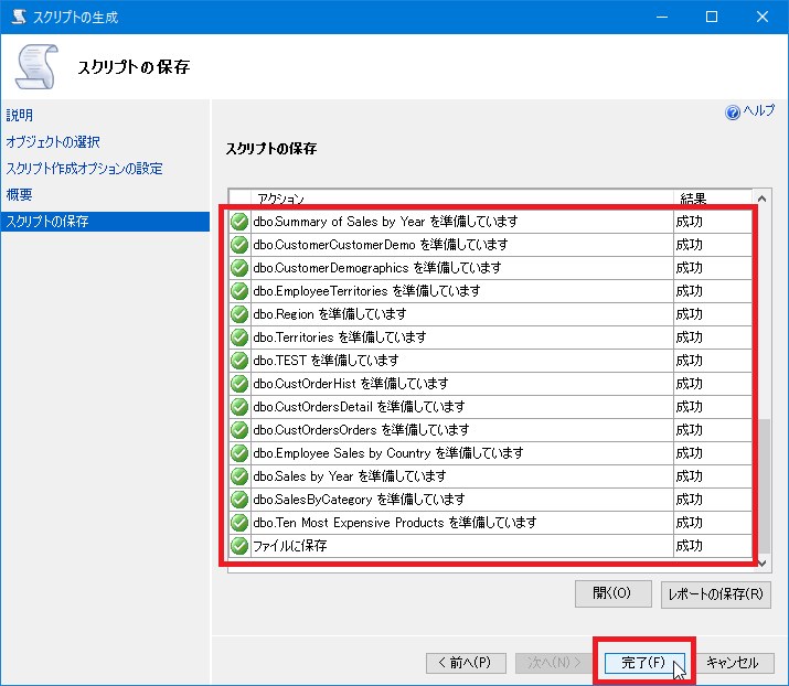 スクリプトの生成処理が開始され、「結果」がすべて「成功」になっていることを確認したら[完了]をクリックします。