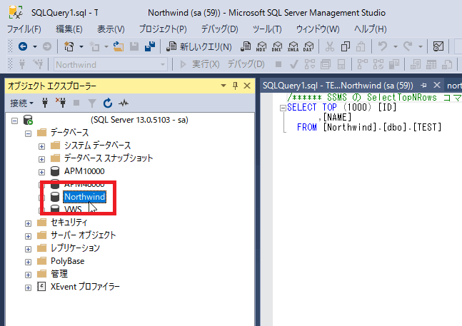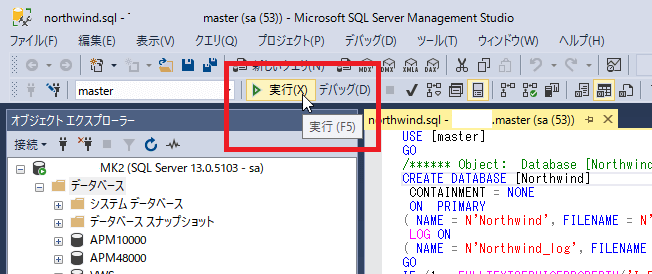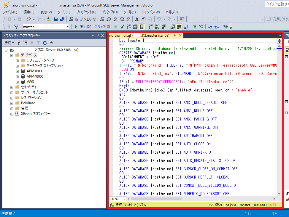 以下のように[Microsoft SQL Server Management Studio]にスクリプトファイルが開かれます。
