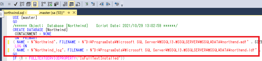 表示されているスクリプトの以下の2行のパスを復元したい下位バージョンのSQL Serverの環境に合わせて修正します。