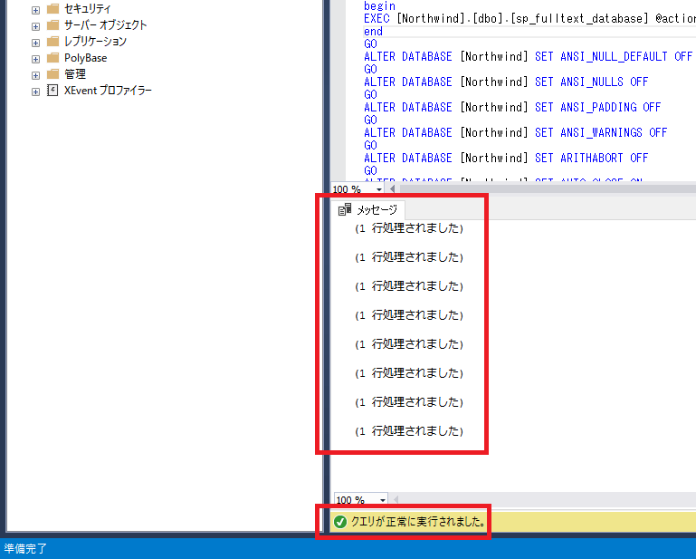 以下のように「(X 行処理されました)」など赤文字のエラーメッセージ以外が表示されて実行が終了、ステータスバーに「クエリが正常に実行されました」と表示されればOKです。