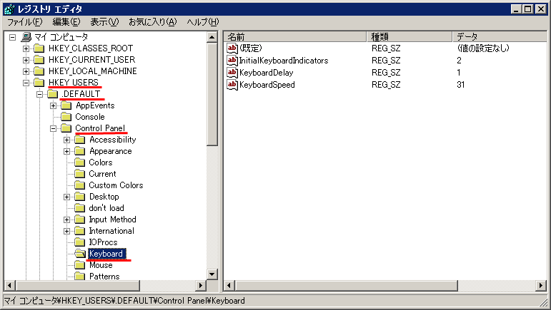レジストリパス:HKEY_USERS\.DEFAULT\Control Panel\Keyboard