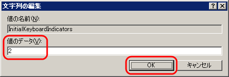 [文字列の編集]ダイアログボックスが表示されるので、[値のデータ]を"2"に変更して[OK]をクリック。
