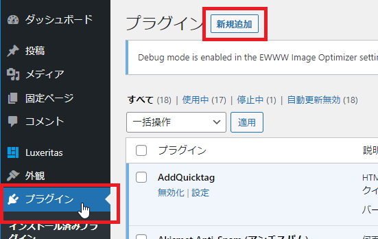 WordPressの左メニューから[プラグイン]をクリックして[新規追加]をクリックします。