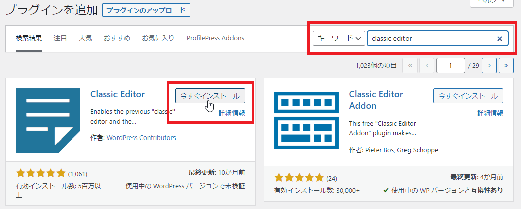[キーワード]に"classic editor"と入力すると「Classic Editor」のプラグインが表示されるので[今すぐインストール]をクリックします。
