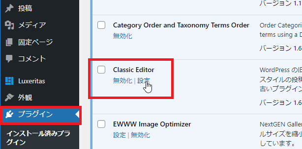 プラグインの一覧から[Classic Editor]の[設定]をクリックします。