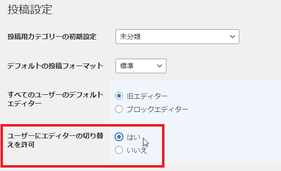 「投稿設定」画面の[ユーザーにエディターの切り替えを許可]のオプションを「はい」に変更して一番下にある[変更を保存]をクリックして設定を保存します。