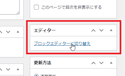 編集画面の左の設定一覧に以下のような[ブロックエディターに切り替え]リンクが表示されるので、クリックするとブロックエディターでの編集画面に切り替わります。