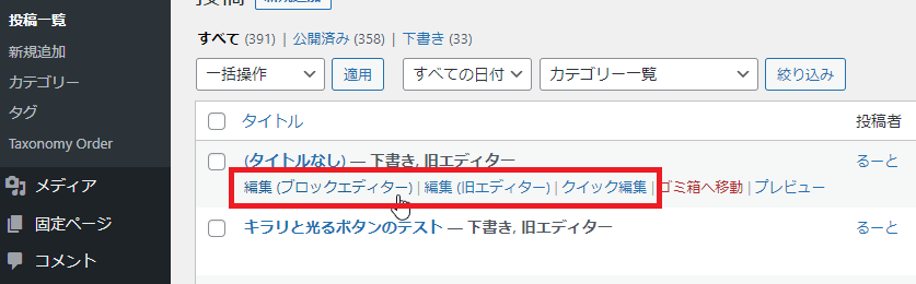 既存の記事や編集中の記事は、記事一覧表示画面から以下のようにどちらのエディターで編集するか選択できるようになります。
