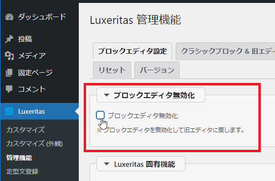 例えば私が使っているLuxeritasでは、テーマの管理メニューに以下のような設定があります。