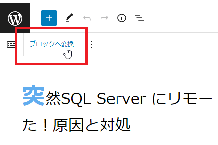 旧エディターで作成された記事をブロックエディターで作成した状態に変換するには、対象の記事をブロックエディター編集画面にしてから左隅にある[ブロックへ変換]をクリックします。