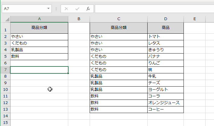 まず「商品」シートに「商品分類」の一覧の表、「商品分類」とその「商品分類」に所属する「商品」の一覧表を作成します。