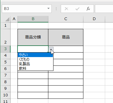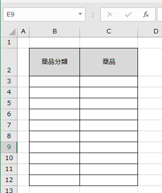データの入力は、セルB3からB12までで、B列「商品分類」の隣のC列は、商品を入力するセルになっています。