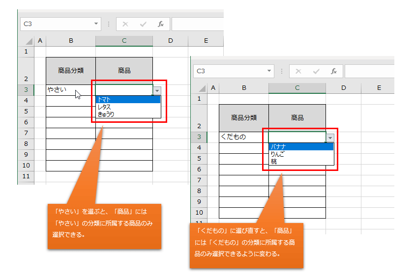 B列のセルで「商品分類」から何れかの分類名を選択したら、選択された「商品分類」に所属する「商品」だけが隣のC列のセルのドロップダウンリストに表示されるようにします。