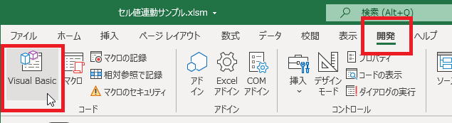 リボンの[開発]タブをクリックし、[Visual Basic]コマンドをクリックします。