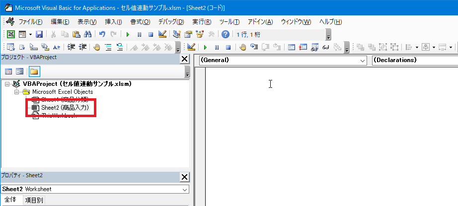 「Microsoft Visual Basic for Applications」画面が表示されるので、左ペインから[商品入力]シートをダブルクリックします。