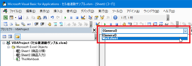 真っ白のエディタ画面が表示されるので、上部にある[(General)]と表示されているコンボボックスから[Worksheet]を選択します。