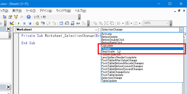 エディタに以下のような[Change]イベントプロシージャが表示されることを確認してください。