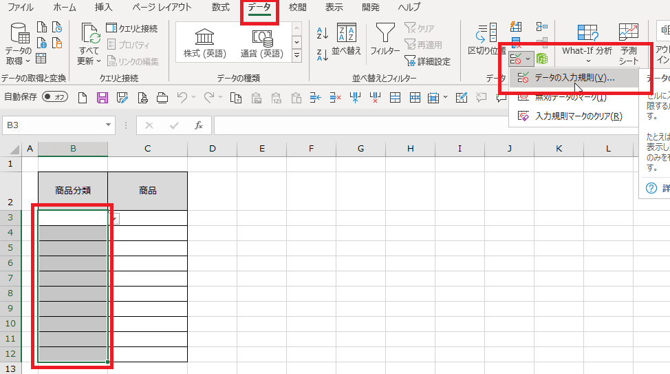 「商品入力」シートのB3からB12までのセルを選択し、リボンの[データ]タブを開いて[データの入力規則]コマンドをクリックします。