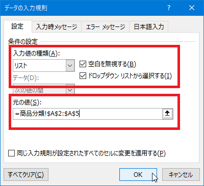 [データの入力規則]ダイアログボックスが表示されるので、[入力値の種類]に「リスト」を選択し、[元の値]に「商品分類」シートのA2からA5までを指定して[OK]をクリックします。