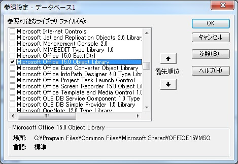 以下に「Microsoft Office 15.0 Object Library」の参照手順を記載します。