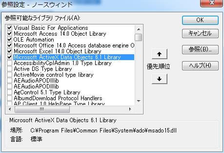 また、紹介するサンプルプログラムでは"Microsoft ActiveX Data Objects"(ADO)ライブラリを使用していますので、合わせて参照設定しておく必要があります。