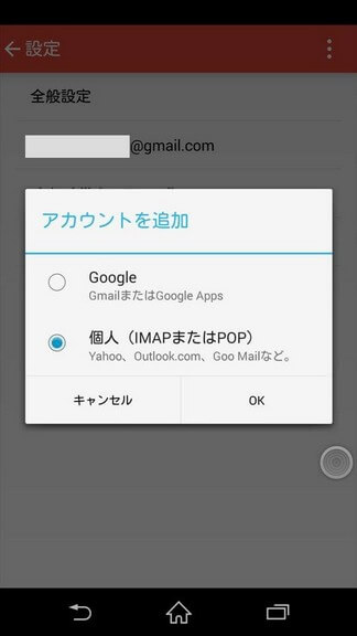 [アカウント追加]画面がポップアップするので、[個人(IMAPまたはPOP)]を選んで[OK]をクリックします。