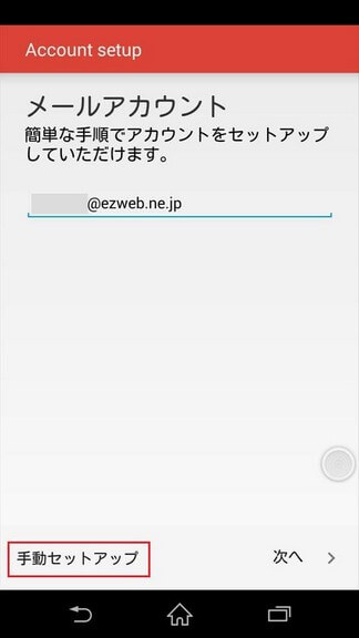 [メールアカウント]画面が表示されるので、携帯Eメールアドレスを入力し、[手動セットアップ]をタップします。