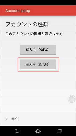 [アカウントの種類]画面が表示されるので、[個人用(IMAP)]をタップします。