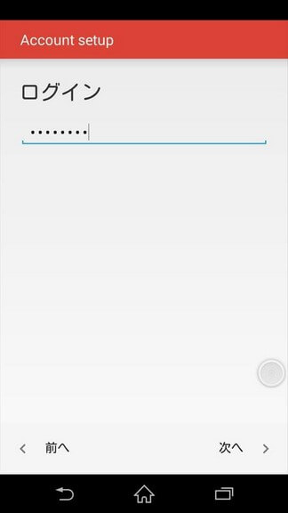 [ログイン]画面が表示されるので、あらかじめ入手しておいたIMAPサーバーに接続するためのパスワードを入力し、[次へ]をタップします。
