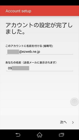 [アカウント設定が完了しました。]画面が表示されますので以下の設定を任意に行って[次へ]をタップします。