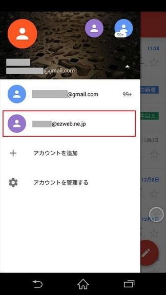 Gmailのメニューを開くと携帯Eメール(xxxxx@ezweb.ne.jp)のアカウントが追加されていることが確認できます。