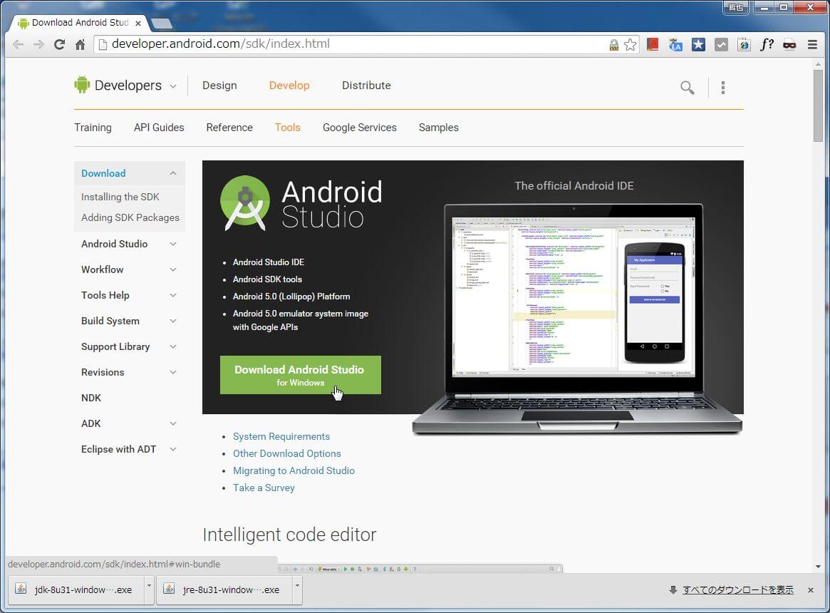 Android Studioのダウンロードサイト「Download Android Studio and SDK Tools | Android Developers」にアクセスし、[Download Android Studio for Windows]をクリックする。